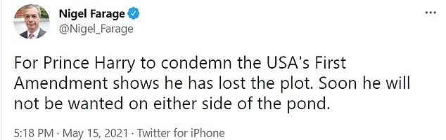 “For Prince Harry to condemn the USA’s First Amendment shows he has lost the plot. Soon he will not be wanted on either side of the pond,” British politician Nigel Farage tweeted in response to Harry’s comments.