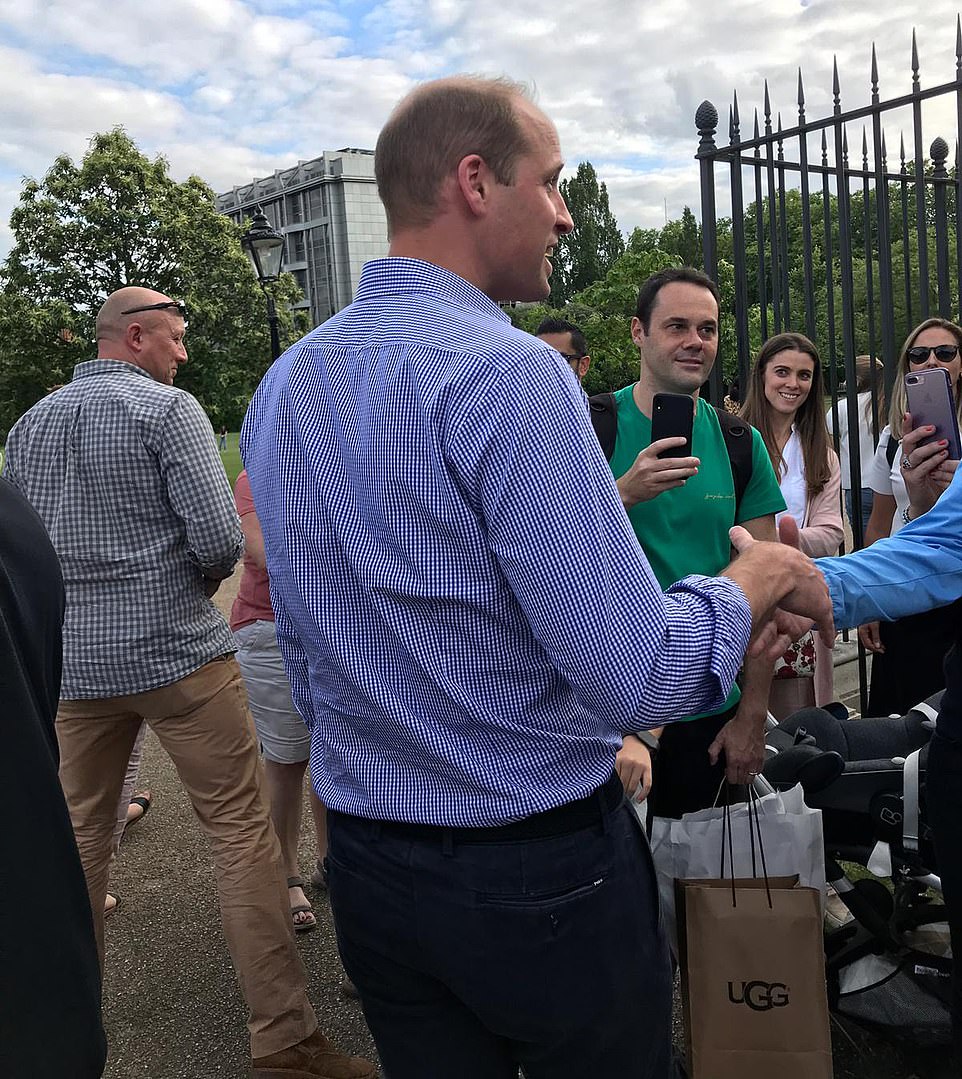 At around 6.45pm they were surprised to see Prince William walk quietly and without fanfare through the palace gates into Kensington Gardens with a small security detail.