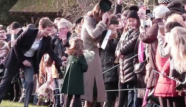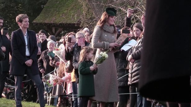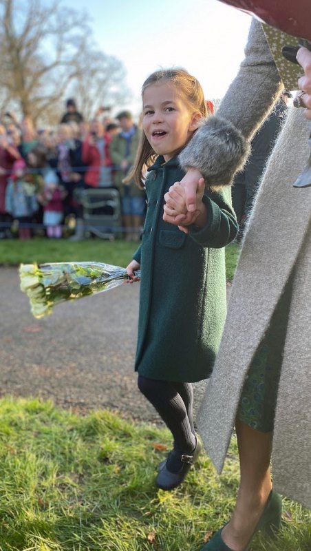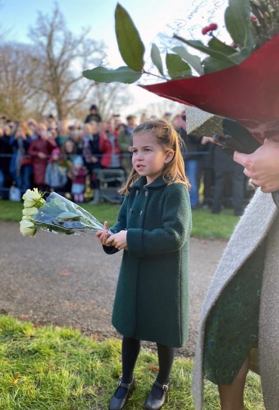 This is an adorable moment Prince Charlotte refused to hand over the bouquet of flowers she received from a star-struck young fan to a royal aide during Christmas day at Sandringham.