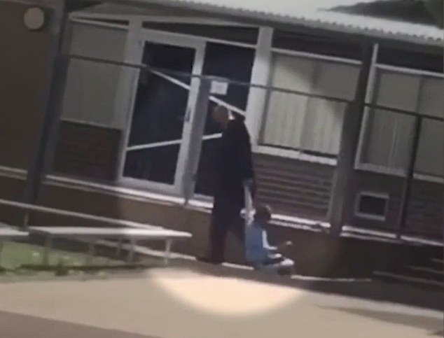 It is unclear whether the pupil was being physically abusive to other students or teachers before he was being dragged away.