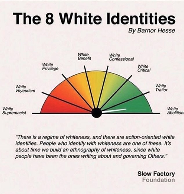 From alleged ‘bad’ to ‘good’ identities, the scale includes white supremacist, white voyeurism, white privilege, white benefit, white confessional, white critical, white traitor, and white abolitionist.