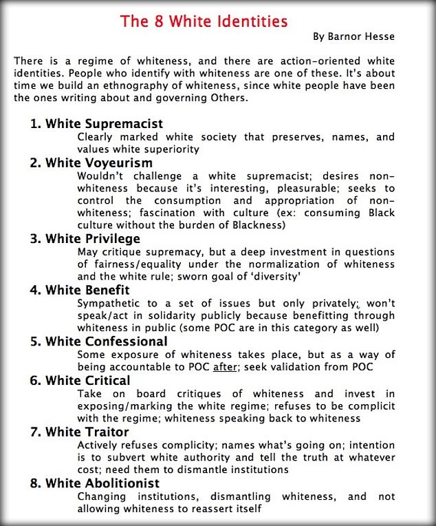 People who identify with whiteness are one of these. It’s about time we build an ethnography of whiteness, since white people have been the ones writing about and governing Other,” the text accompanying the description of each of the ‘identities’ reads.