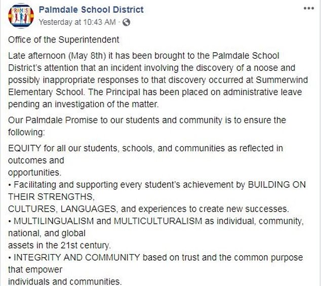 “Our Palmdale Promise to our students and community is to ensure the following: EQUITY for all our students, schools, and communities as reflected in outcomes and opportunities,” Palmdale School District Superintendent stated following the controversy.