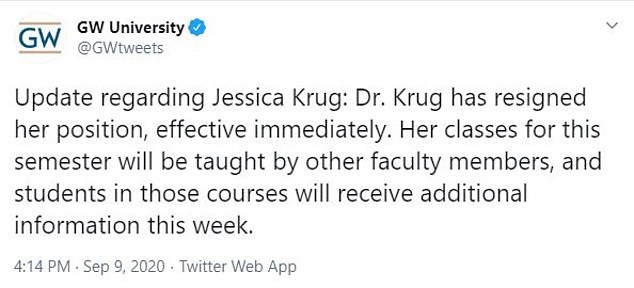 “Update regarding Jessica Krug: Dr. Krug has resigned her position, effective immediately,” they announced on Twitter.