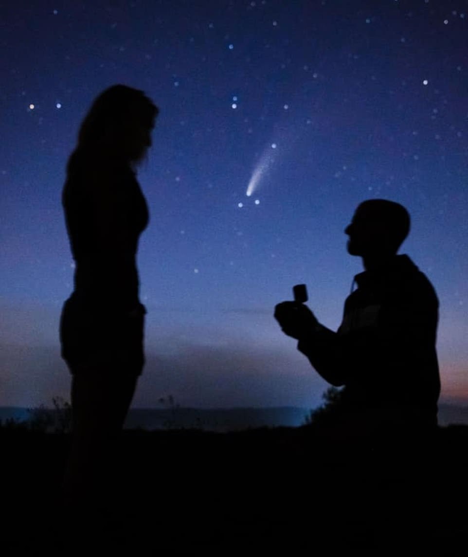 A space enthusiast popped the question in a rare proposal as the comet known as Neowise passed across the sky above him and his girlfriend.