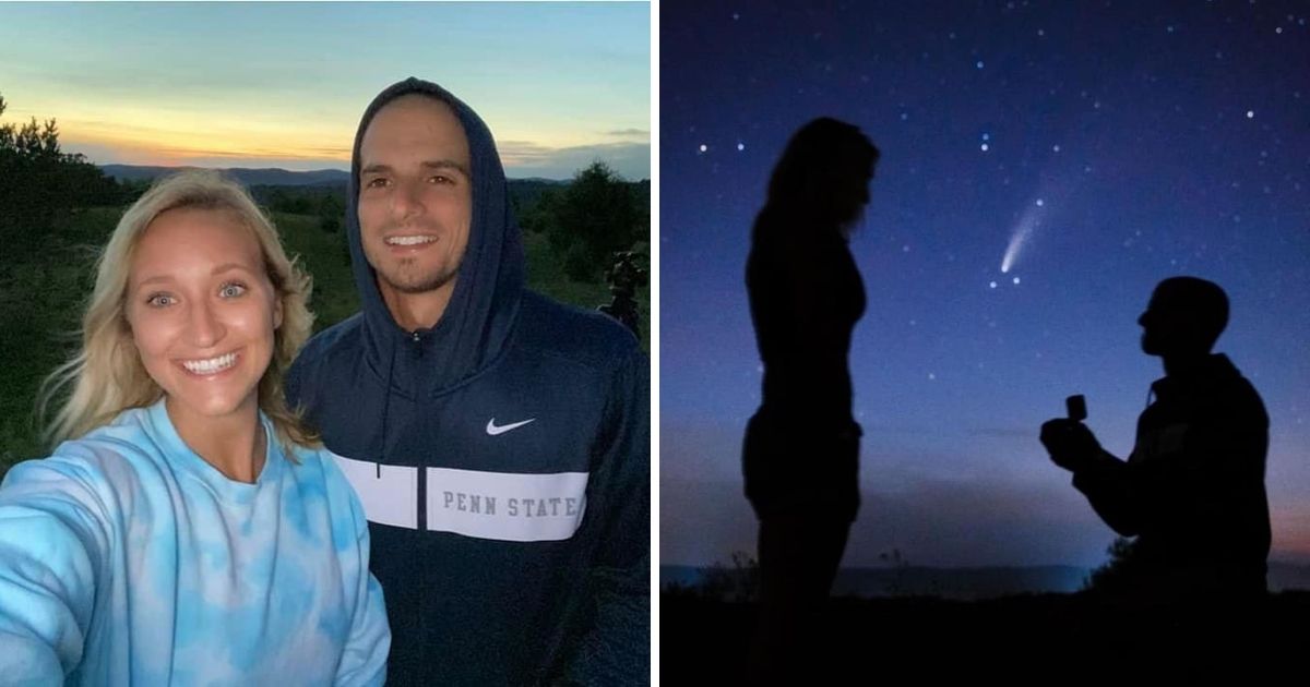 What Erica didn’t expect, however, is that John would drop on his knee and pop the question right as the comet soared through the dark blue sky above the pair.