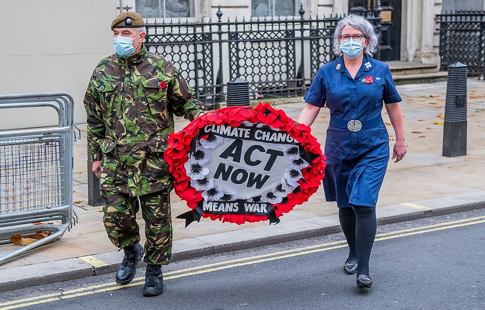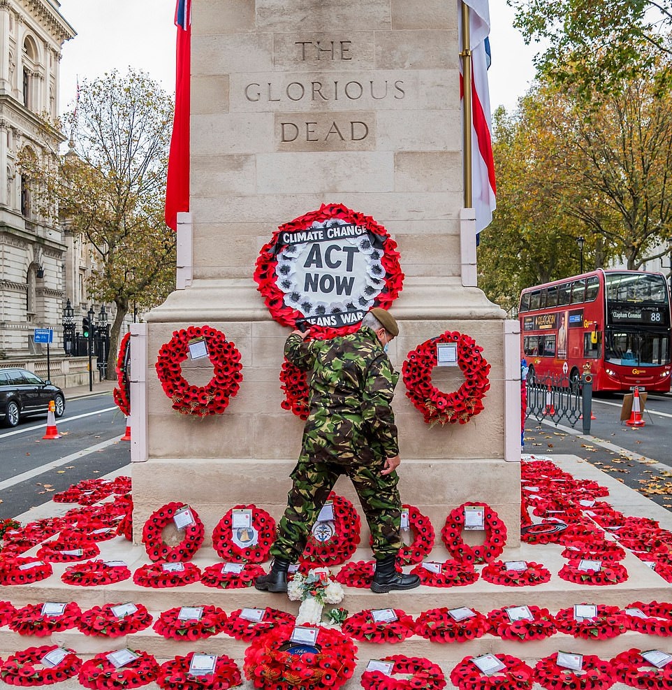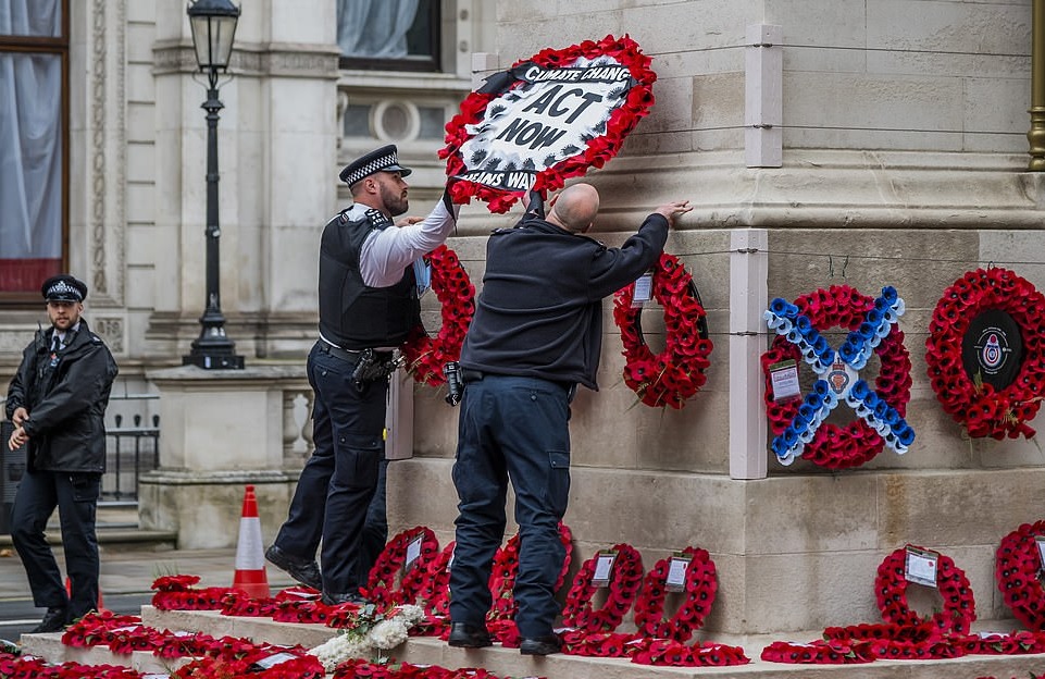 “Climate change means war,” the wreath the protester hung on the Cenotaph read. “Act now.”