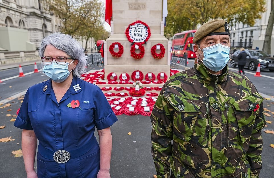 The demonstration took place at the Cenotaph on Whitehall in London, UK, where 64-year-old former private Donald Bell and 53-year-old NHS nurse Anne White made a stand along with two other protesters.