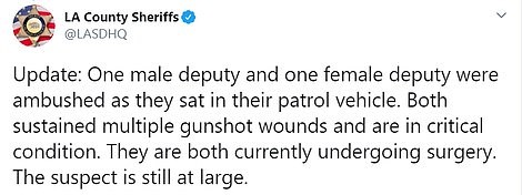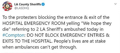 “To the protesters blocking the entrance & exit of the HOSPITAL EMERGENCY ROOM yelling ‘We hope they die’ referring to 2 LA Sheriff’s ambushed today in #Compton: DO NOT BLOCK EMERGENCY ENTRIES & EXITS TO THE HOSPITAL,” LA county sheriff’s office wrote on Twitter.