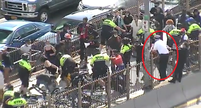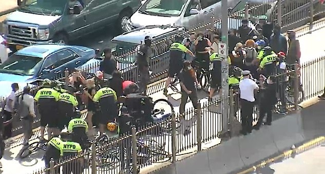 The incident occurred on Brooklyn Bridge in New York where several anti-police protesters got arrested for attacking police officers, including the NYPD Chief of Department Terence Monahan, during a clash with pro-police protesters.