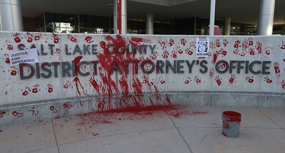 On the wall in front of the entrance of the Utah government building, the protesters also left behind a series of handprints made by dipping their hands into the red paint used to vandalize the office.
