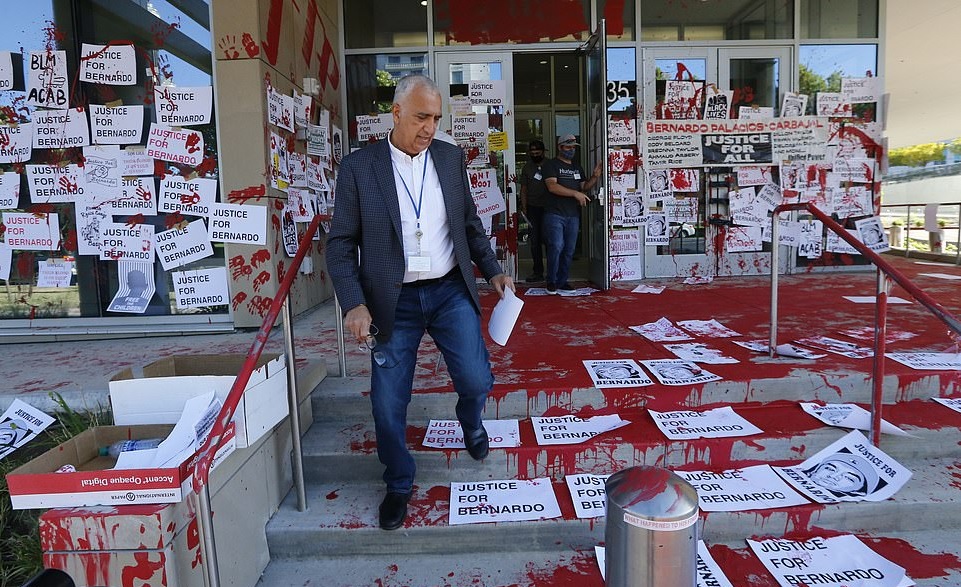 In protest against the authorities’ decision not to pursue any charges against officers Neil Iversen and Kevin Fortuna, some 150 demonstrators had gathered in front of Gill’s office before smearing the building in red paint, resembling blood, and covering it in signs that read: “Justice for Bernardo.”