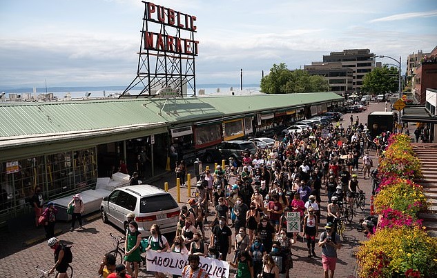 Wielding a banner that read ‘abolish police,’ a large crowd of protesters marched down the public market and stopped at several locations before reaching their final destination – The Starbucks store that opened back in 1971.