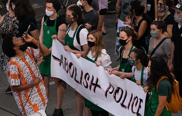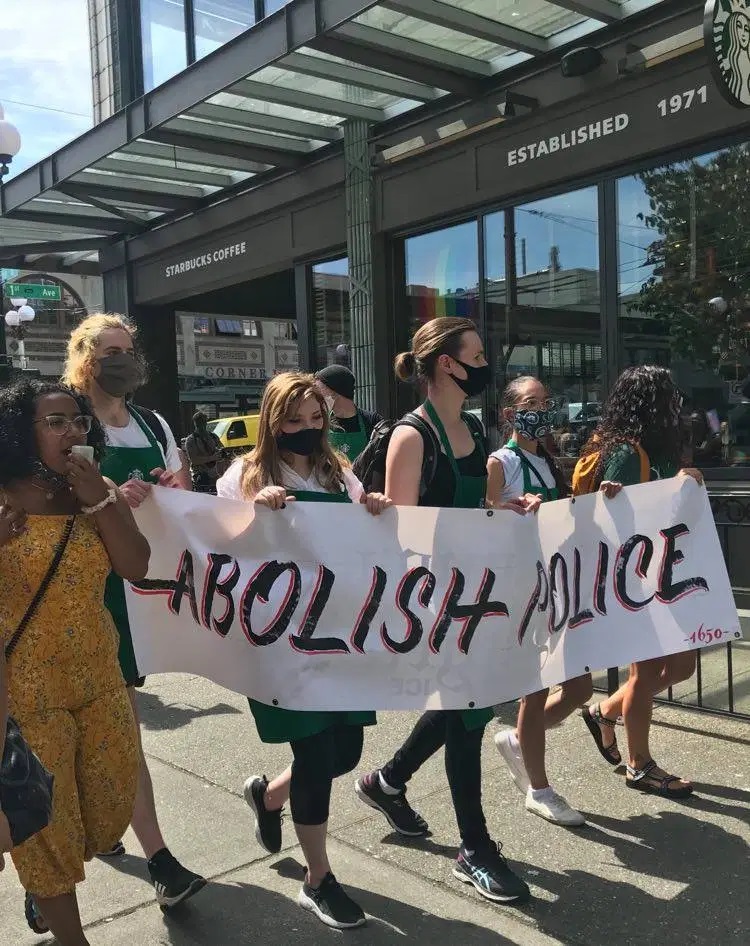 During the protest, the demonstrators demanded that Starbucks abolishes the funding for the Seattle Police Department.