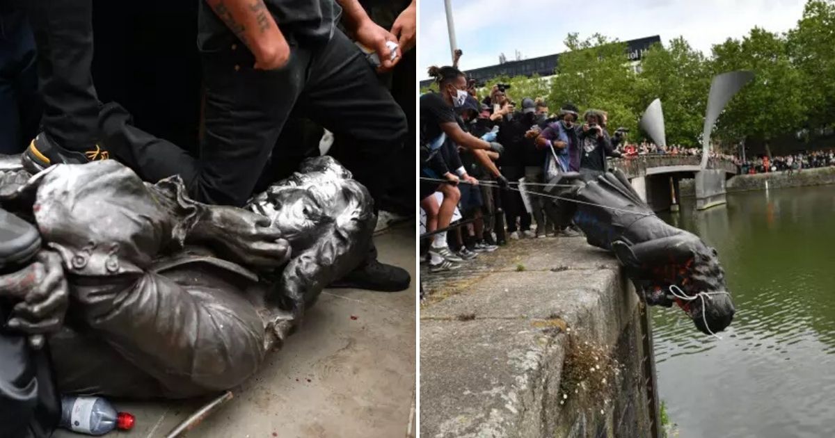 After the Bristol protesters were done kicking and tramping over the slave trader’s statue, they hurled it into the harbor waters, therefore ending the need for the debate whether the statue should be removed or not.