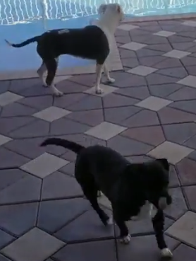 As soon as her mother opens the door, both the dogs ran to the pool but stopped right at the edge.