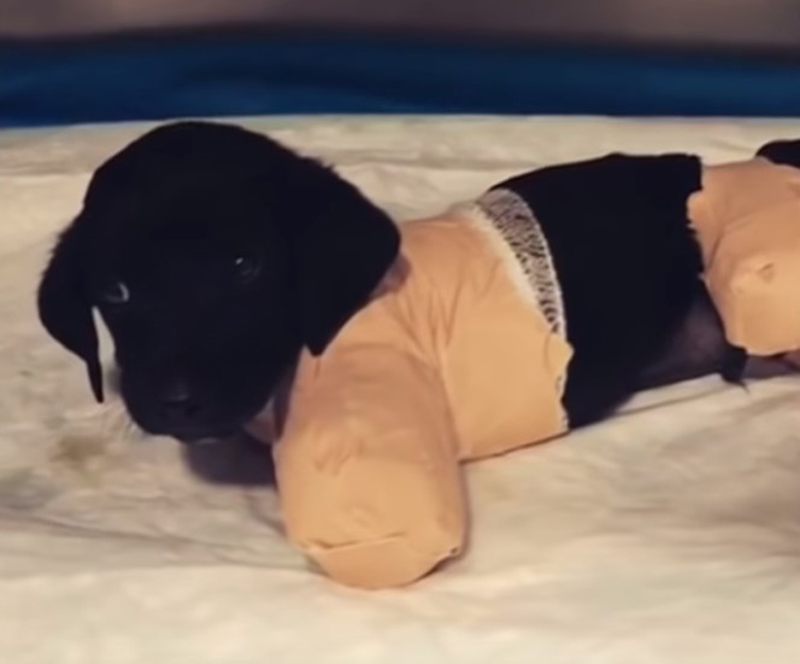 The person chopped off its limbs and tails using massive equipment and left the puppy in pain.
