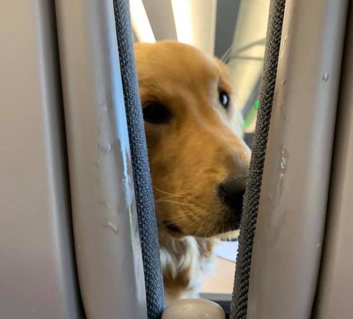 The Golden Retriever puppy and his mom, Ursula Aitchison, were just getting settled on their flight from London to Ibiza.