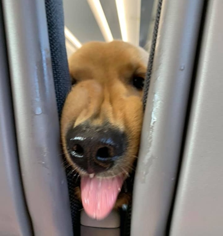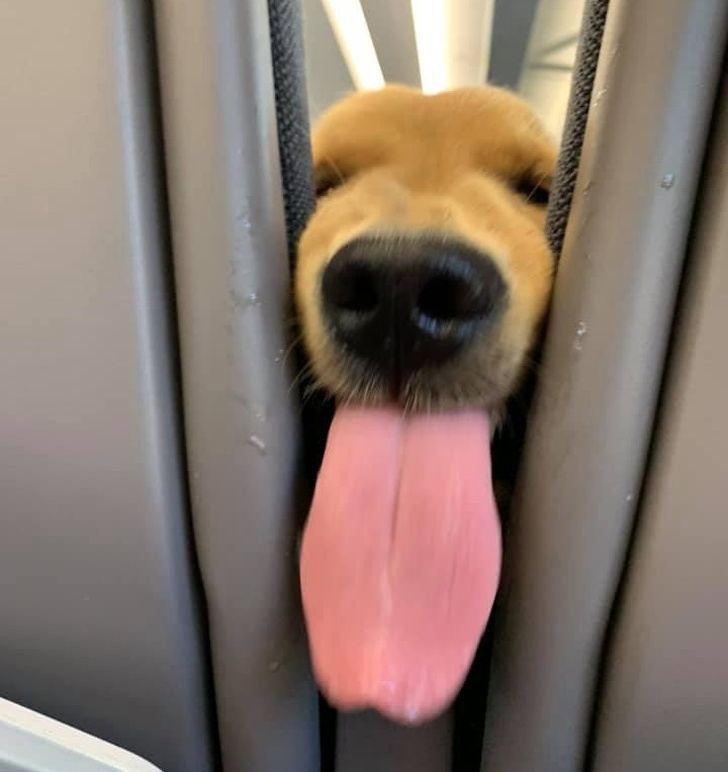 The adorable puppy pressed his face between the seats trying to reach the chips. He was drooling over the snack and it made everyone on the plane laugh hard.