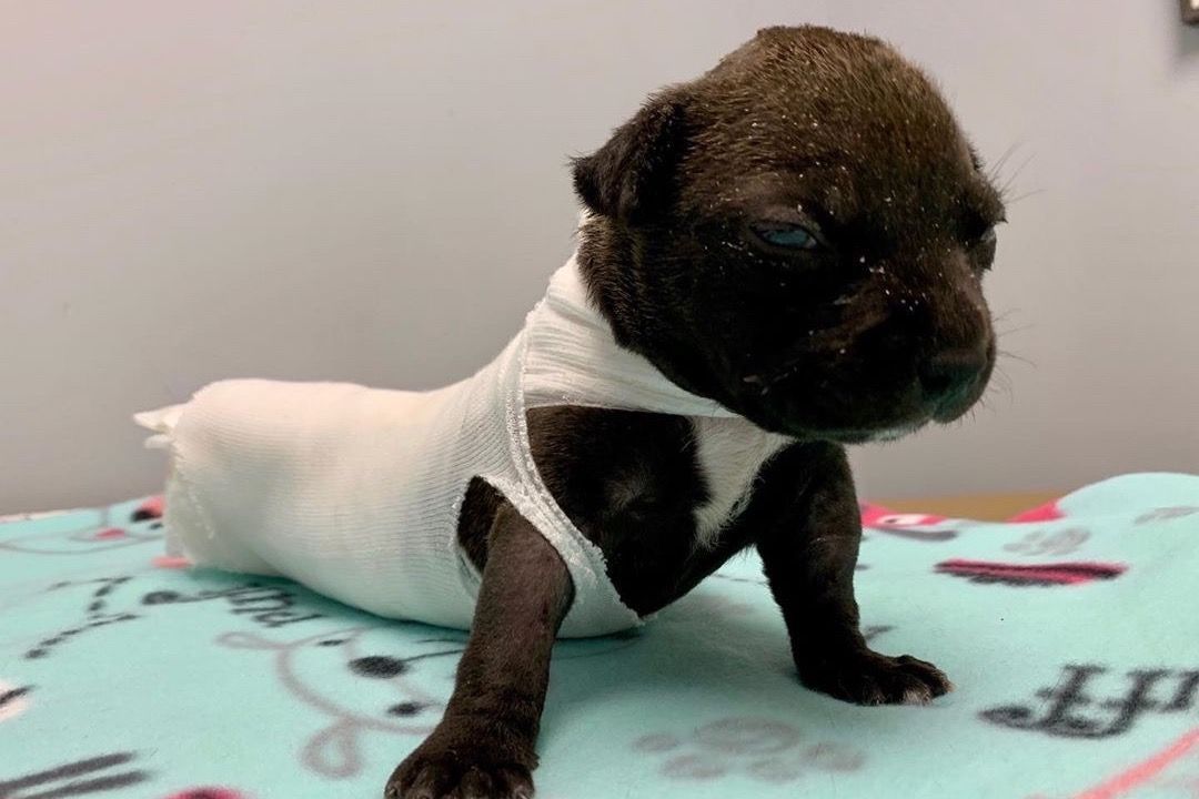 A 3-week-old pit bull mix pup was found in a severe condition after thugs cut off a part of her tail, burned her back, and beat her up before wrapping her in a plastic bag and dumping her in the trash.
