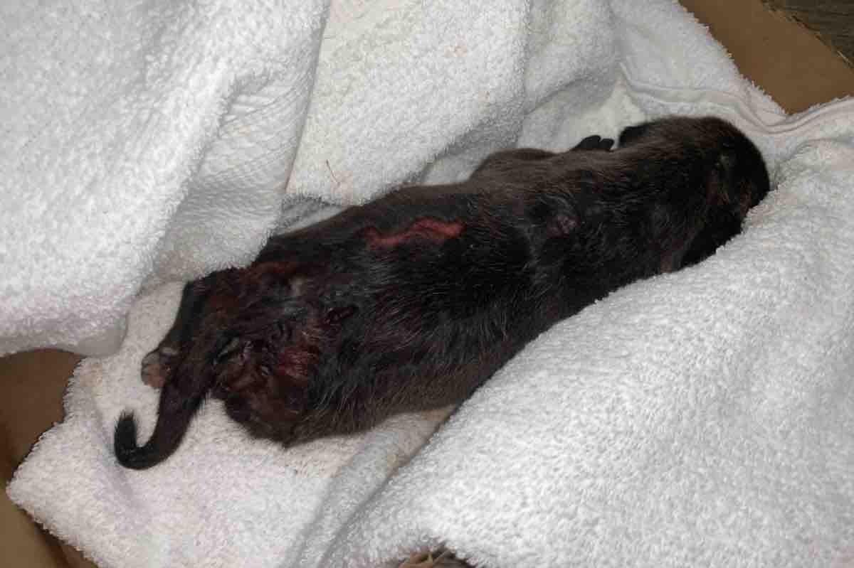 “It appears as if she was burned with a caustic substance or a metal object like an iron. She is only a few weeks old, had a portion of her tail cut off, and can not walk due to being beat and assaulted.”