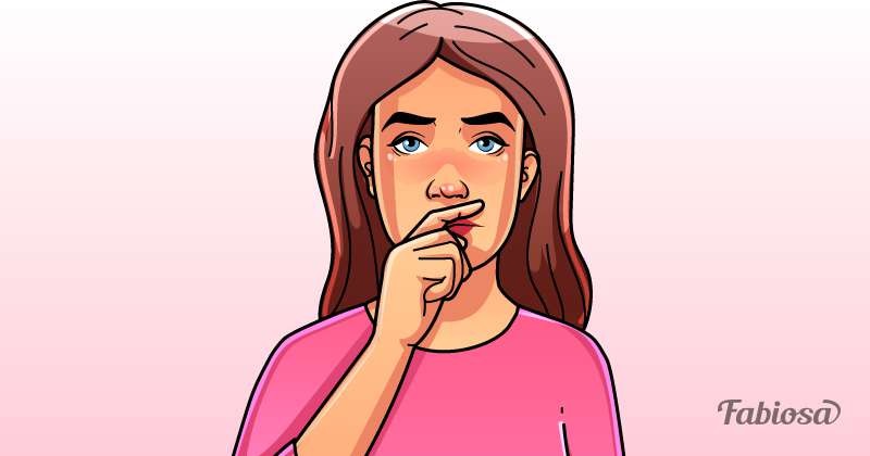 Next, let’s have a closer look at the woman on the right. She is partially covering her mouth while touching her nose with her finger.