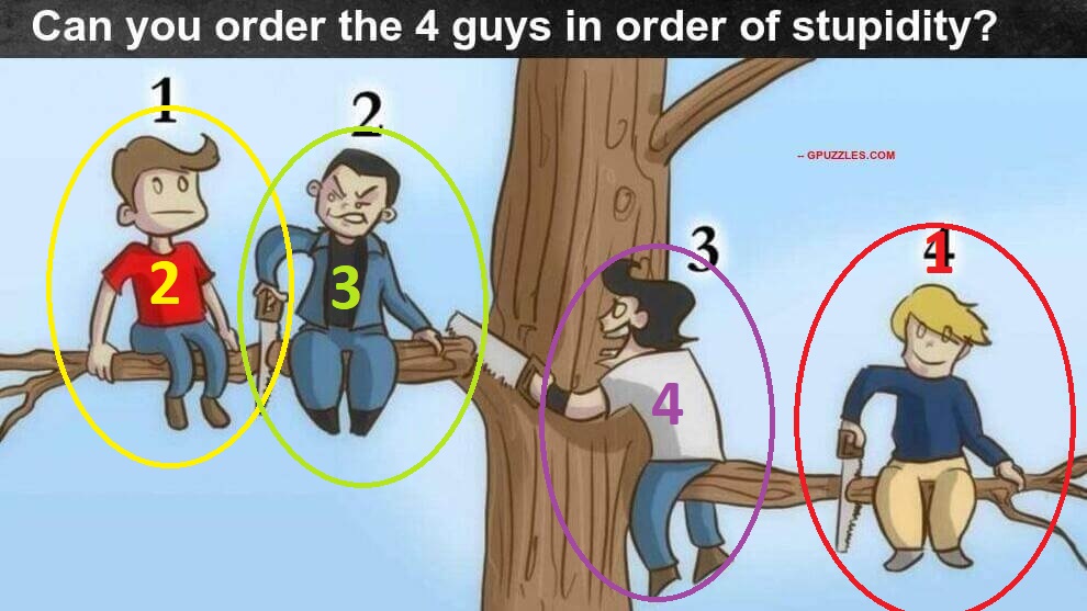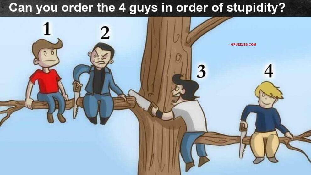 Let’s start with the dumbest contender. It has to be the guy on the right because he is literally sawing through the branch he’s sitting on. Why on Earth would he do that?