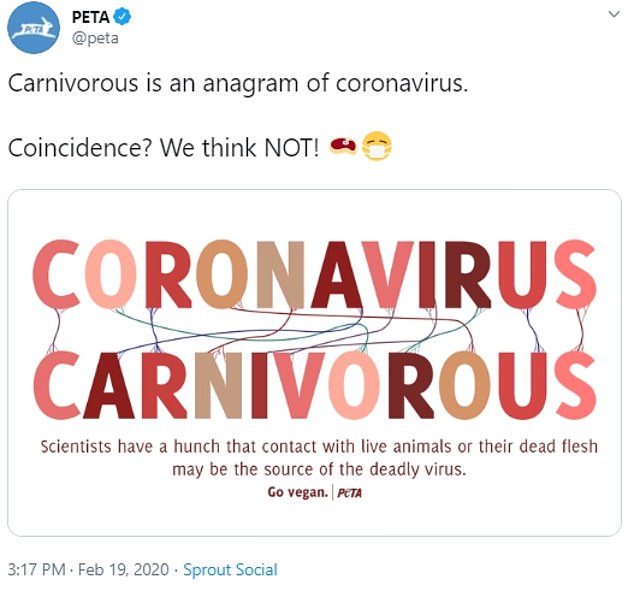 Below the words coronavirus and carnivorous, PETA had also written: “Scientists have a hunch that contact with live animals or their dead flesh may be the source of the deadly virus.”