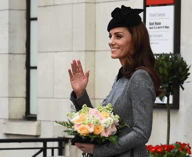 The Duchess looked elegant as she donned a grey Catherine Walker coat, which she teamed with her new favorite Gianvito Rossi block heels and a black Mulberry clutch.