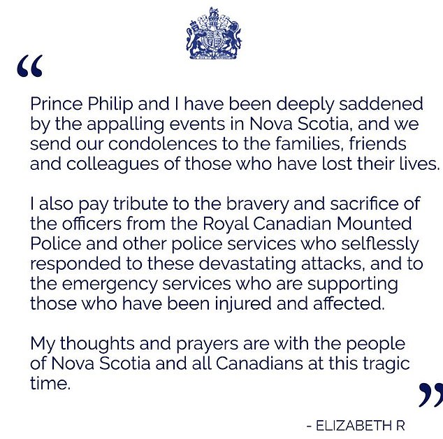 It read, “Prince Philip and I have been deeply saddened by the appalling events in Nova Scotia, and we send our condolences to the families, friends and colleagues of those who have lost their lives.”
