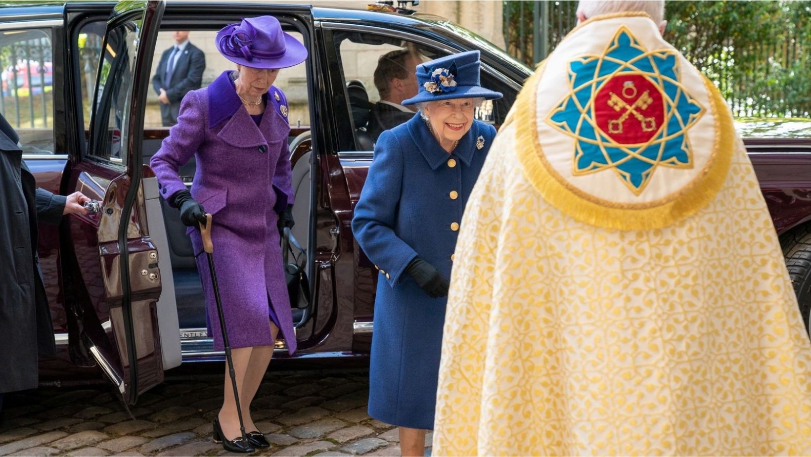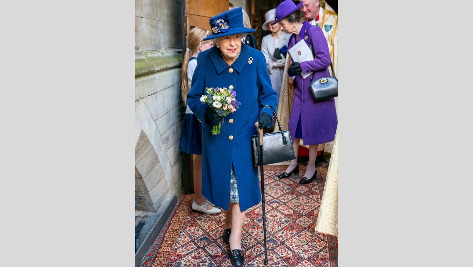 The queen’s daughter, Princess Anne, handed her the stick when she stepped out of her royal vehicle, before making her way inside the abbey, walking steadily with her aid across the cobbled floor. She walked freely and confidently, with the stick providing her with a safety net as she made her way from her state limo to the event.