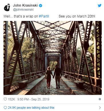 The director posted a picture on his Twitter along with his wife, Emily Blunt who will resume her lead role. In the tweet, John mentioned that Part II had been wrapped see you on March 20!