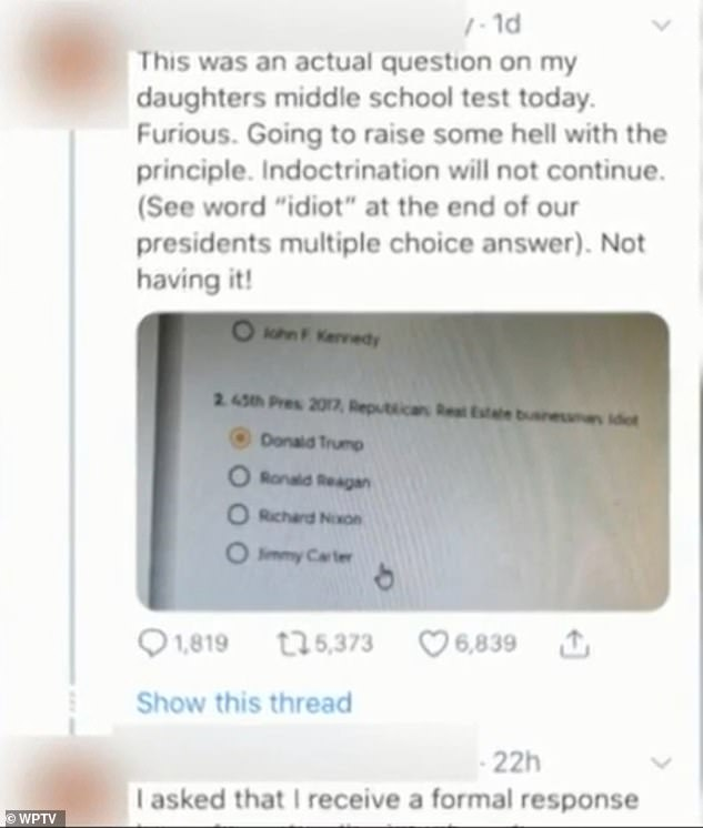 The father of the student, who made the matter public, told WPTV: ‘I don’t believe opinions belong in the classroom whether religion, politics, ethnic background, any of those things.’