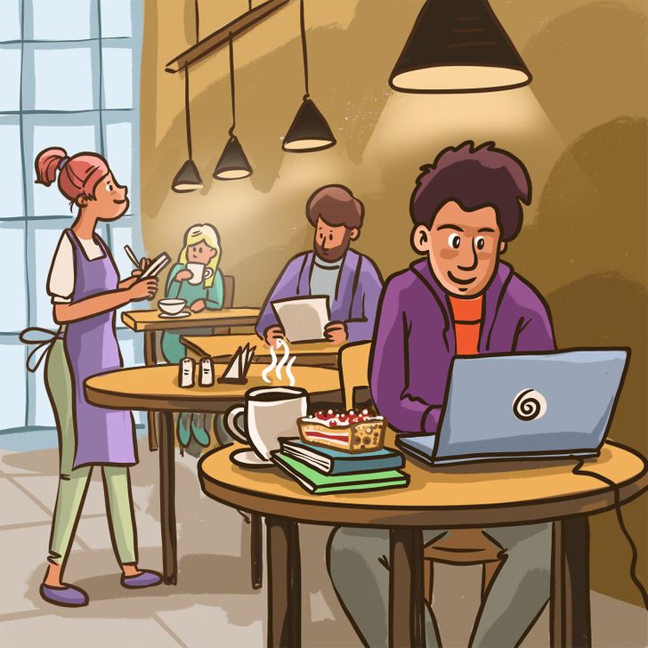 The image shows a coffee shop. There are three customers and a waitress. The first customer is working on his laptop, the second is still checking the menu while the waitress is waiting for him, and the third one is taking a sip of coffee.