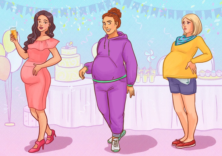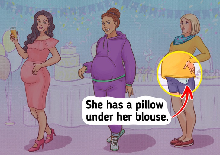 In the image, you can see three ladies attending a baby shower. They all claim to be pregnant, but one of them is lying!
