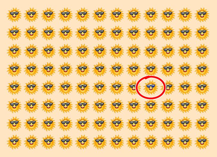 The picture shows suns with sunglasses but one of them is different from the rest. Have you spotted it yet?
