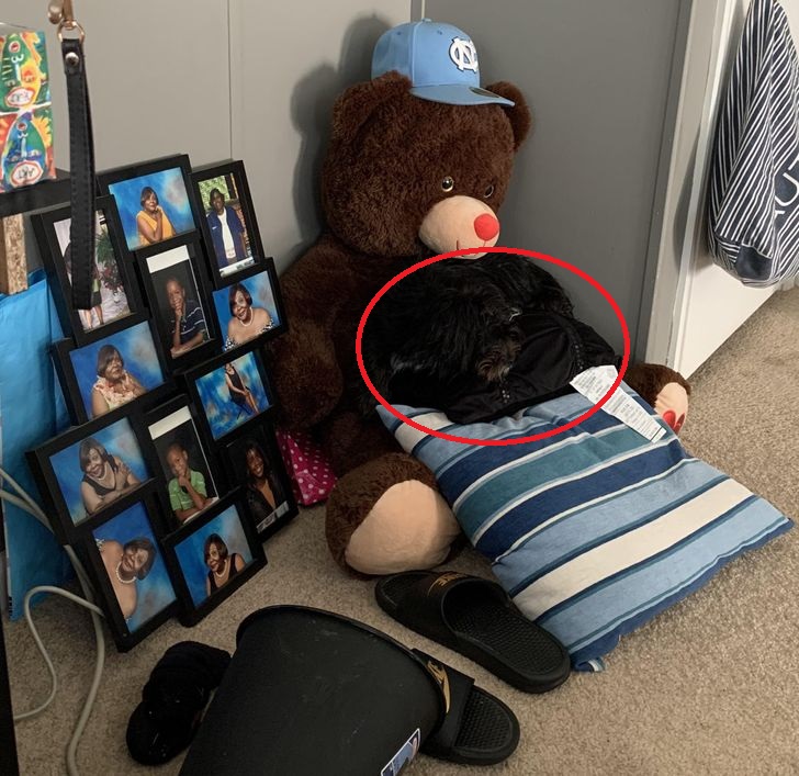 The adorable pooch in the photo doesn’t want to sleep in his bed. Instead, he found comfort in the most unusual place!