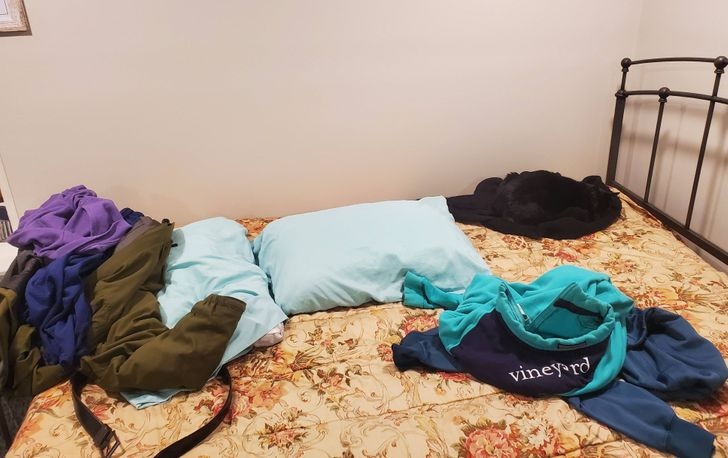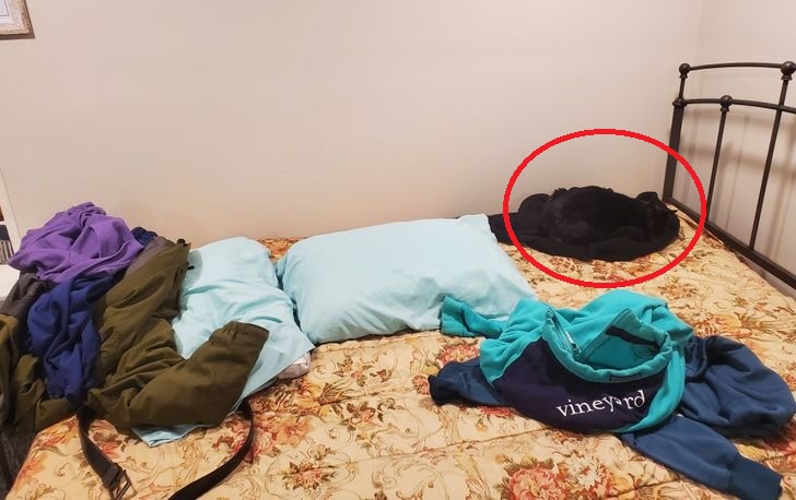 To spot the feline, you’ll definitely need to zoom in. Look for its pointy ears and dark fur on the messy bed.