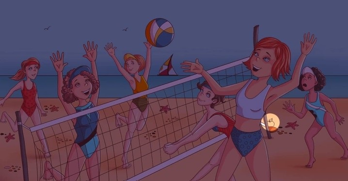 This time, you’re looking at a beach scene showing a bunch of friends playing volleyball on the sand. In the background, you can see the vast ocean and a yacht passing by in the distance.