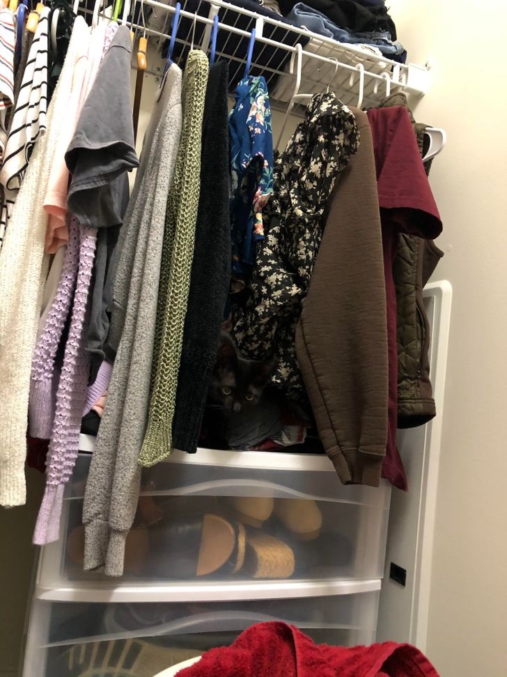 The kitten is looking straight at you and it’s quite big! Check carefully between the clothes and on top of the shelves to spot it.