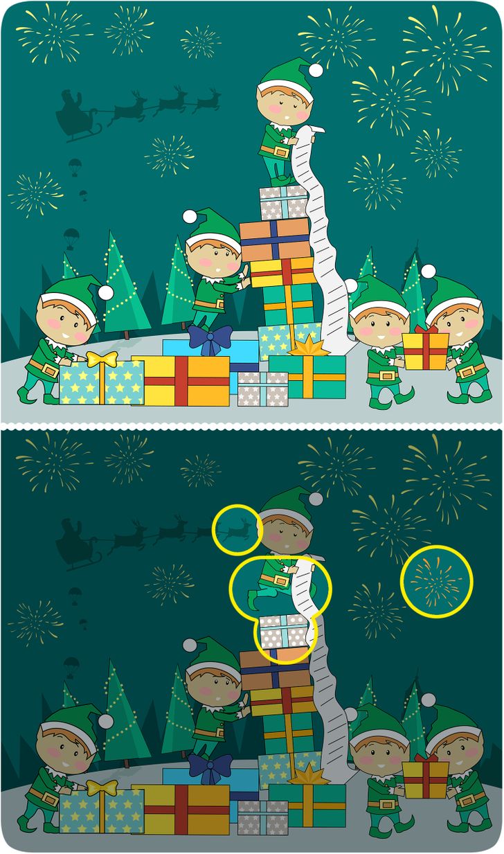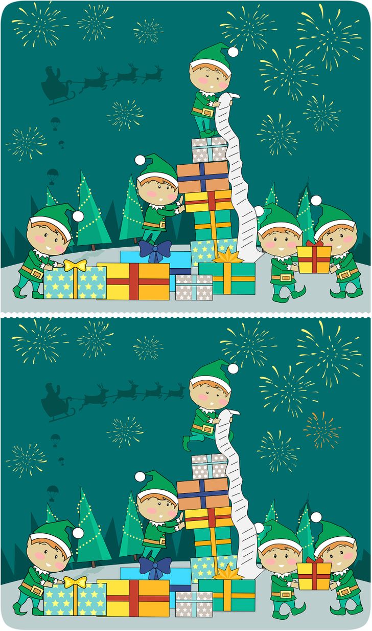 In the background, you can see decorated Christmas trees, Santa’s silhouette, and beautiful fireworks! But there are four differences in the images. Have you spotted them yet?