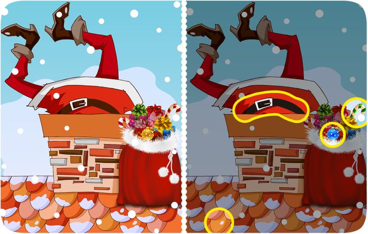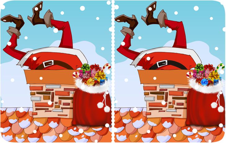 The images show Santa trying to enter a chimney. His red bag is filled with gifts and candies! But there are four differences in the pictures. Have you spotted all of them?
