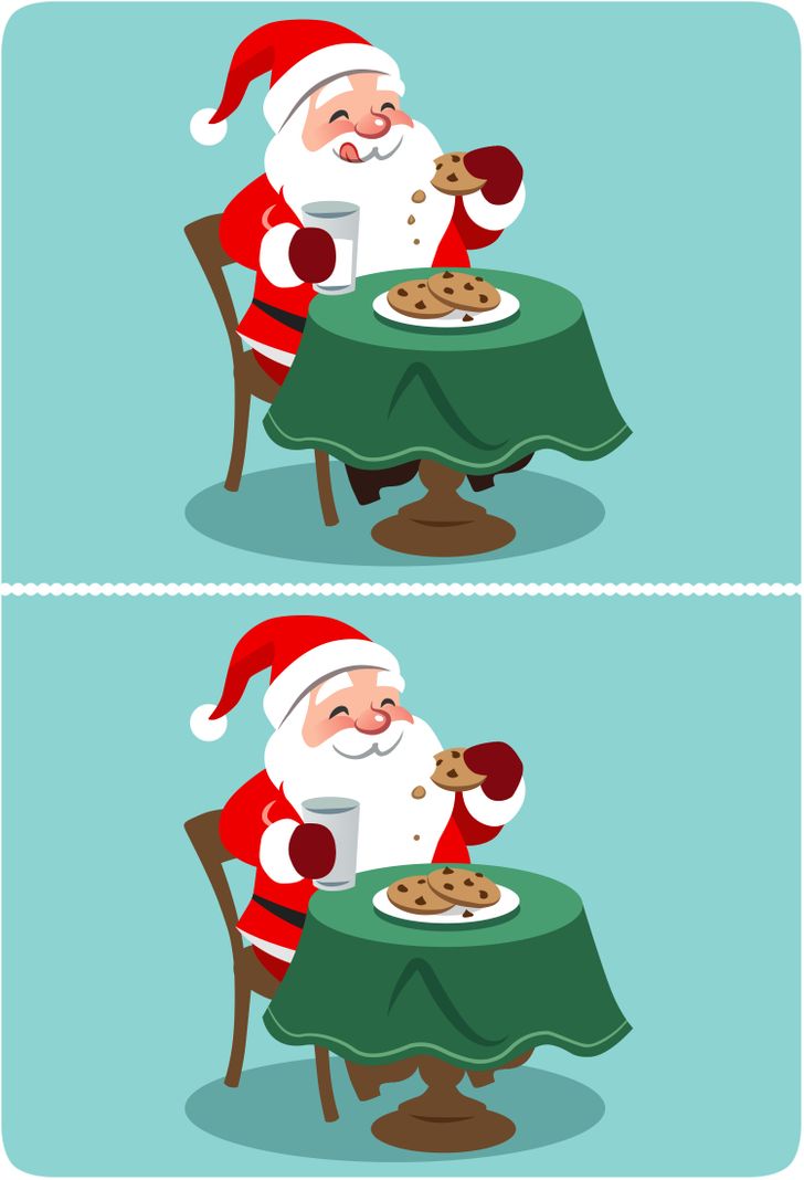 The pictures show Santa Claus enjoying a place of cookies! But there are four differences in the images. Have you found all of them yet?