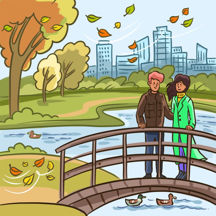The image shows a couple standing on a bridge while watching ducks swimming in the lake. It seems like a great place to relax or take a scroll.