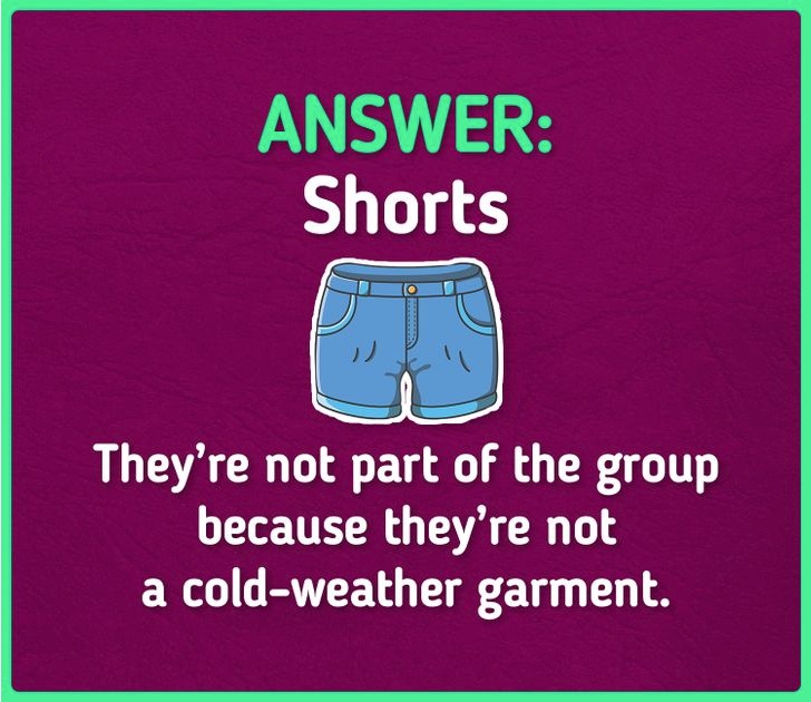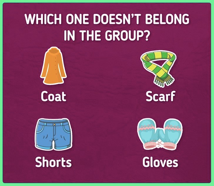One of the objects seen in the group above doesn’t belong with the rest. As you can see, you have to choose from a coat, a scarf, shorts, and gloves.