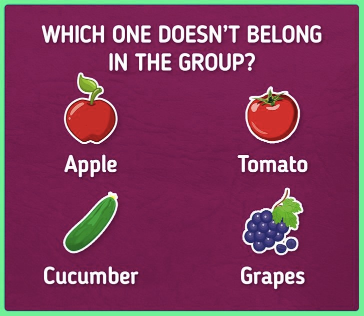 This time, you’re looking at an apple, tomato, cucumber, and grapes. One of them doesn’t belong in the group for a very good reason.