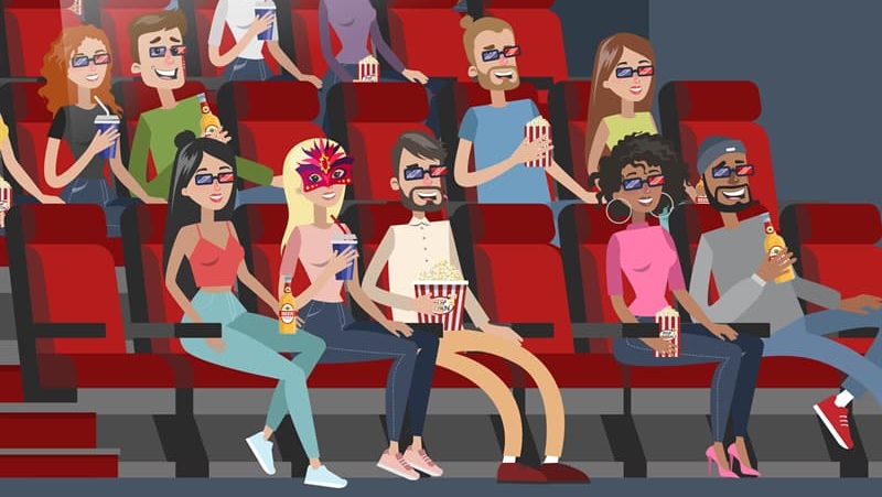 As you can see, the image shows a group of people laughing while watching a funny movie. While some of them are enjoying drinks, others are eating popcorn to their hearts’ content.