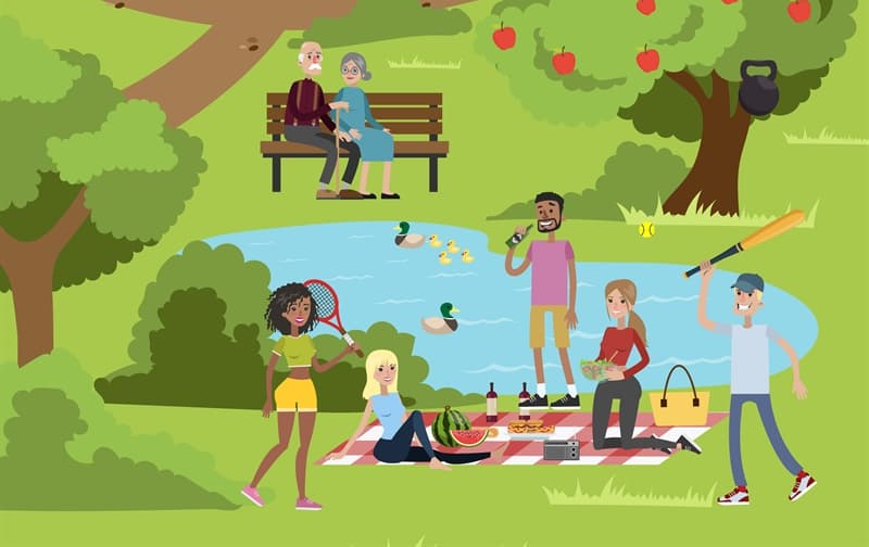 In the scene above, you can see a group of young people having a good time at the park. While a couple is playing badminton, two girls are sitting on a blanket and absorbing the sunlight.