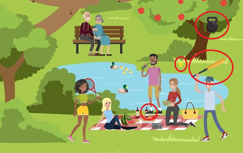One of the mistakes can be found on one of the trees while another is in the hands of a young man. The remaining two mistakes are much less obvious – focus on the objects to see the truth!