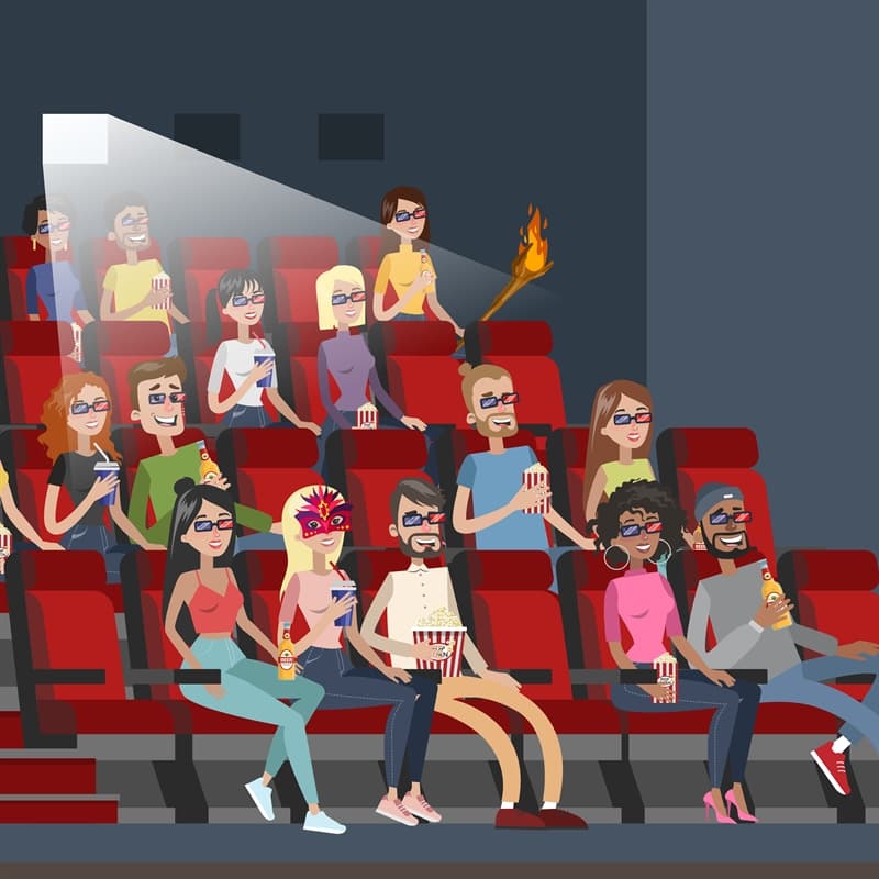 This time, the scene takes place in a cinema where people are enjoying a funny movie while eating popcorn and drinking juice.